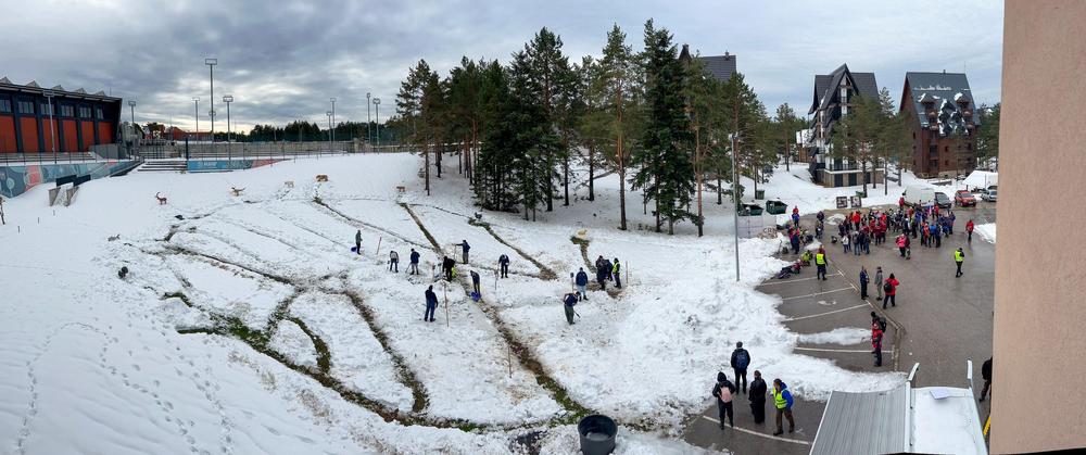Edellisen viikon helteet muuttuivat Serbian kisapaikalla vuoriston laskettelukeskuksessa ensin vesisateeksi ja sumuksi ja sitten niin rankaksi lumisateeksi, että kilpailu keskeytettiin kahdeksi päiväksi ja neljän päivän loppuottelut ammuttiin kisahotellin viereisellä kentällä viikonlopun aikana. Suomalaisille maasto- ja 3D-ampujille tuttu elementti saattoi olla hieman outo kisajärjestäjille varsinkin, kun alkuperäinen kisapaikka sai käyttökiellon - onneksi - puissa olleen raskaan lumen takia. Varmasti silloin oli ainut mahdollisuus ottaa käyttöön hätäsuunnitelma hotellin vieressä olevan kentän muuttamiseksi kisakentäksi lumilapioiden avulla. Ja sillä mentiin. Kuvista voitte päätellä, miten erikoinen keli olikaan. Oletteko ennen nähneet haita lumikasassa?