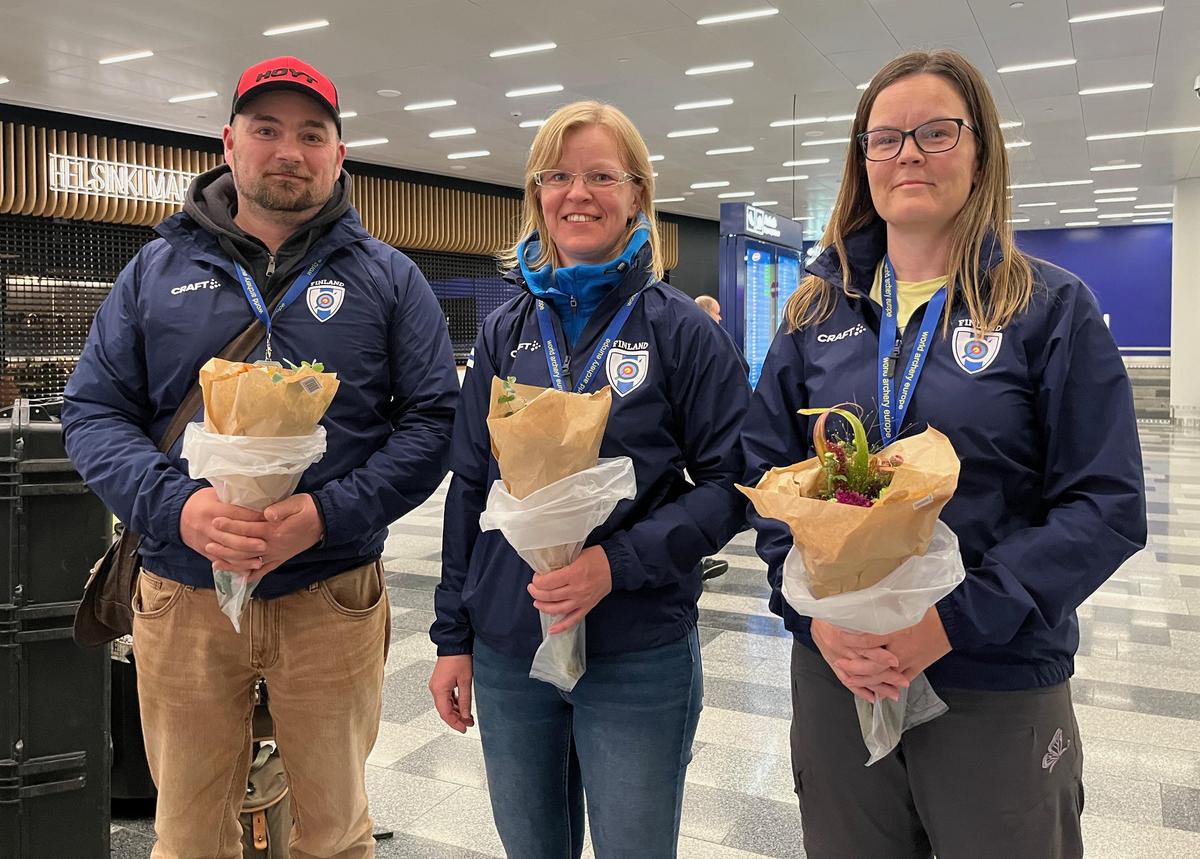 Aikaisin yöllä tämän vuorokauden puolella saapuivat 3D-edustusampujamme Helsinki-Vantaan lentokentälle, jossa hallituksen puheenjohtaja Kari Koskinen heitä odotti kukkien kera. Kisat olivatkin poikkeukselliset tänä vuonna, sillä lunta tuli Divcibaressa, Serbian vuorilla yllättäen 60 cm parin päivän aikana. Voimme varmasti todeta, että suomalaiset olivat kuin elementissään!