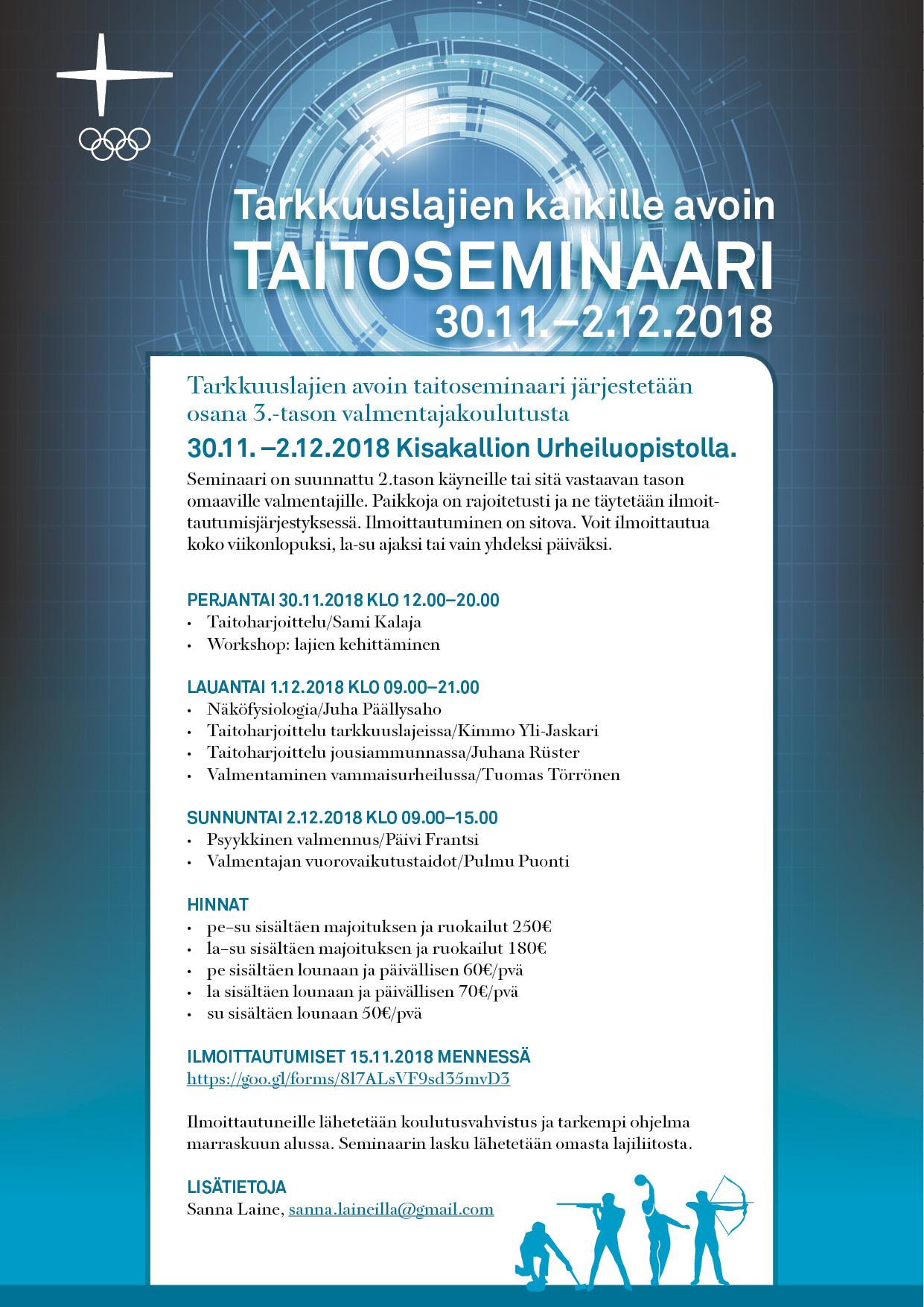 Tarkkuuslajien avoin taitoseminaari järjestetään osana 3.-tason valmentajakoulutusta 30.11. –2.12.2018 Kisakallion Urheiluopistolla. Seminaari on suunnattu 2.tason käyneille tai sitä vastaavan tason…
